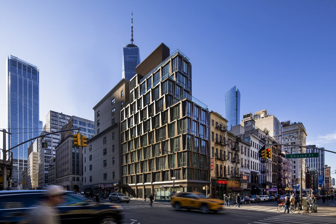 108 Chambers is a 10-story mixed use building in the Tribeca neighborhood of New York City. The unique facade features custom geometric angular slab/spandrel metal panel formations surrounding the windows on the entire exterior, customized to the architect’s design. Because this project had specific intentions for the ways in which the facade would be shaped, metal was an ideal choice. The finish, Deco Bronze, is colored using the organic resins of pure aluminum with varied levels of luminosity and glinting creating optical texture. The color and reflectivity of the facade move as the sun moves adding additional dimension to a large facade.