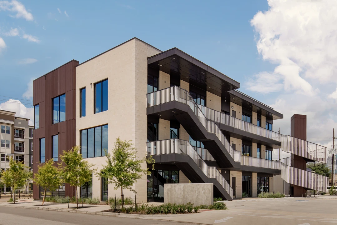 At 3509 Harrisburg, the exterior features our Mature Rust finish which brings warmth and depth, while evoking a sense of history and resilience to resonate with Houston’s industrial roots. Complementing this is our blackened steel finish, Gun Metal, on the soffit providing a sleek contrast enhancing the building’s modernity. The result is a dynamic facade and rich tapestry of textures that resonates with the history of the area while pushing the boundaries of modern architectural design.