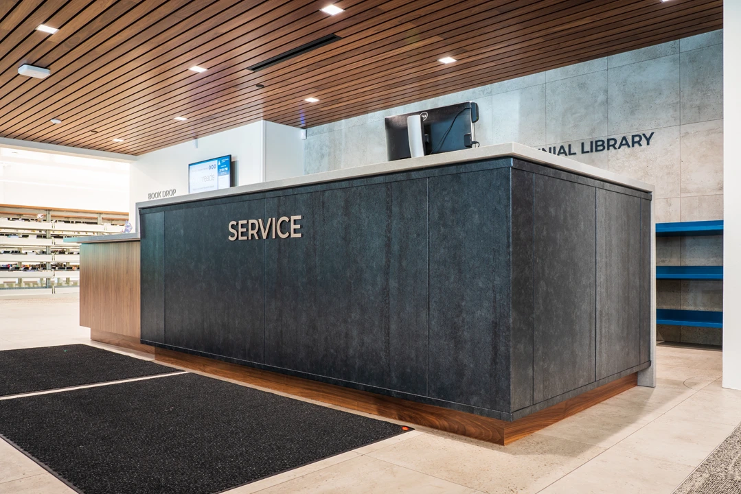 Centennial Library received fresh updates, including a new reception desk clad in Pure + FreeForm’s Frozen Titanium finish. The library went under a large renovation project, doubling in size, and adding several spaces for work, study, and relaxation. Our blackened Steel finishes make an excellent focal point for front entrances as they capture light in dynamic and unexpected ways.
