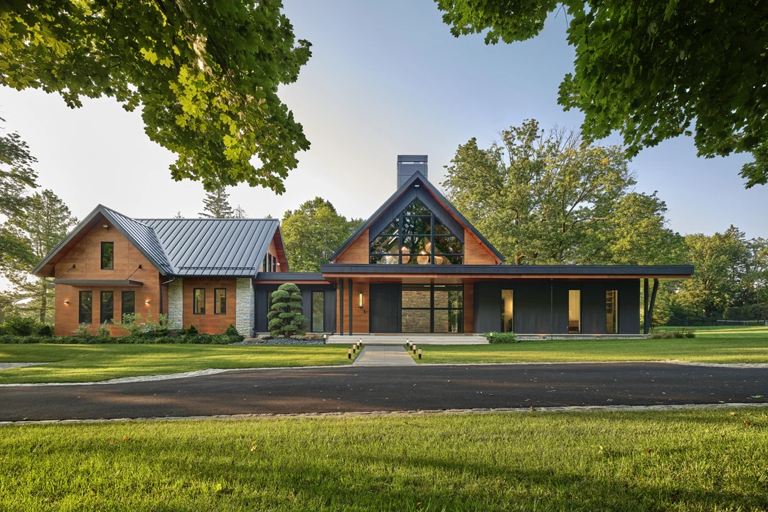 The Modern Rustic Guest House blends natural charm with contemporary detailing, featuring Pure + FreeForm’s Gun Metal finish for a cohesive, high-impact design. On the exterior, Gun Metal panels in a micro corrugated profile are installed using the Rivetless Dry Joint Plate system, offering a clean, uninterrupted façade with a refined blackened steel aesthetic. This material continuity carries into the interior, where the same finish clads the fireplace and chimney, adding texture and depth while maintaining a unified architectural language. The result is a guest house that feels both grounded and modern, with metal panels that elevate its rustic character.