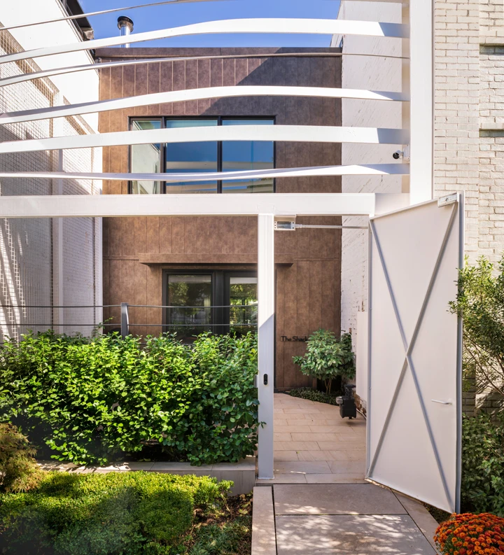 Known by the homeowners as “The Shack,” the property represents their desire to prove not all DC rowhouses are made of brick. Transforming the previously flat black facade of this Private Rowhouse, the homeowners themselves chose a deep, matte bronze with a dynamic texture. The material is subtle enough to blend with surrounding homes, while contrasting the white detailed gate and surrounding greenery. The homeowners also opted for non-traditional vertical panels, aligning with their design intent to stand out on the block, in a stunning and lively finish.